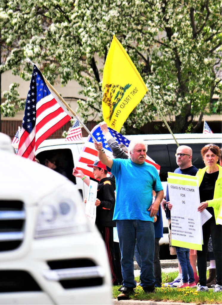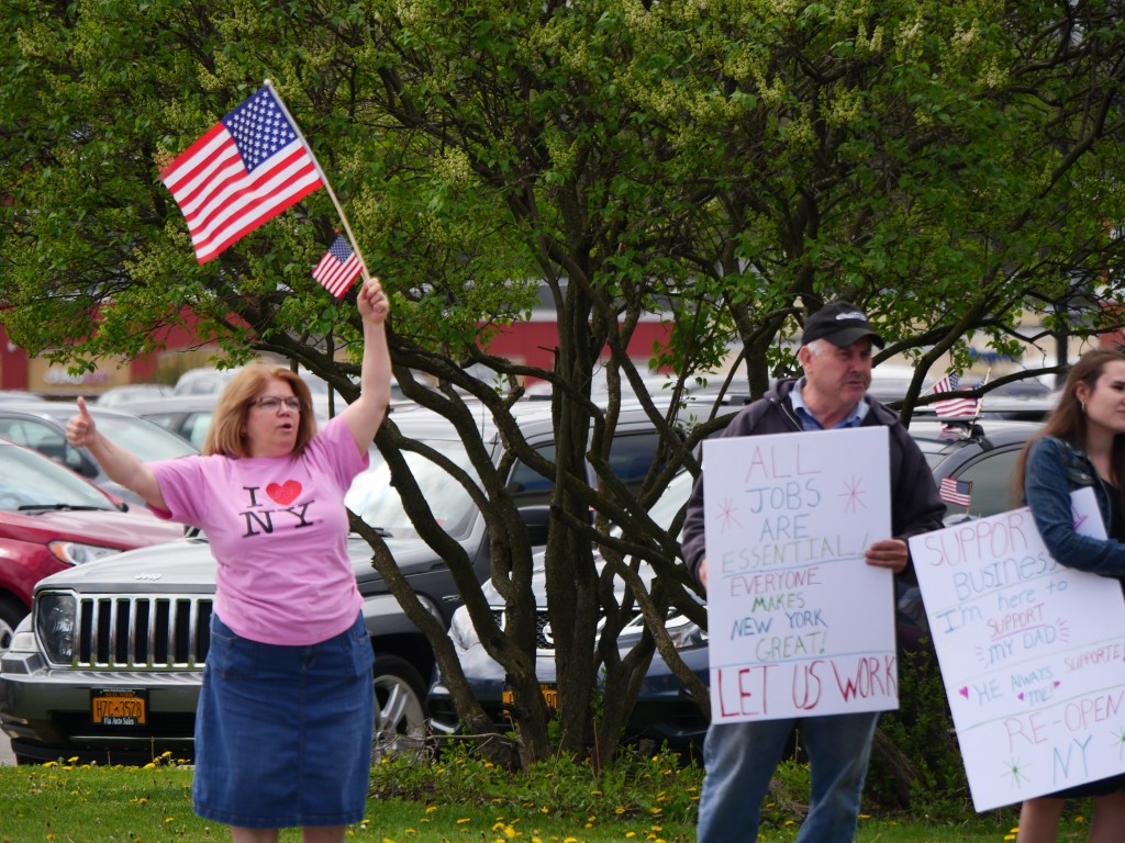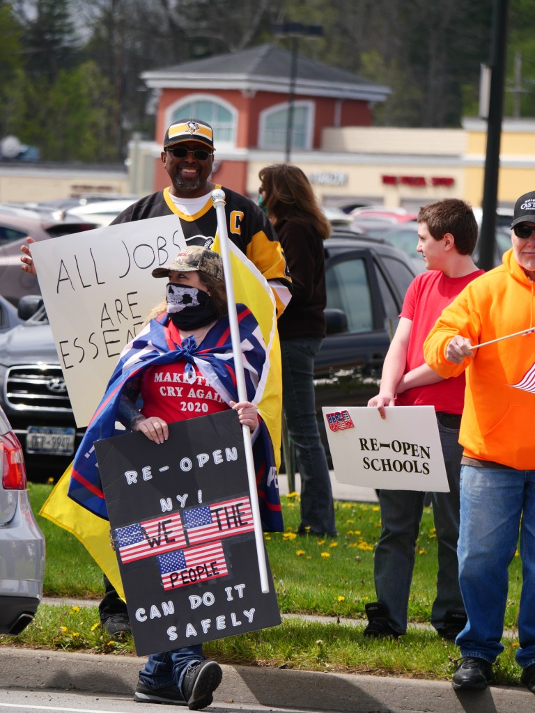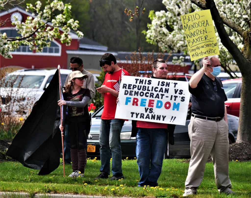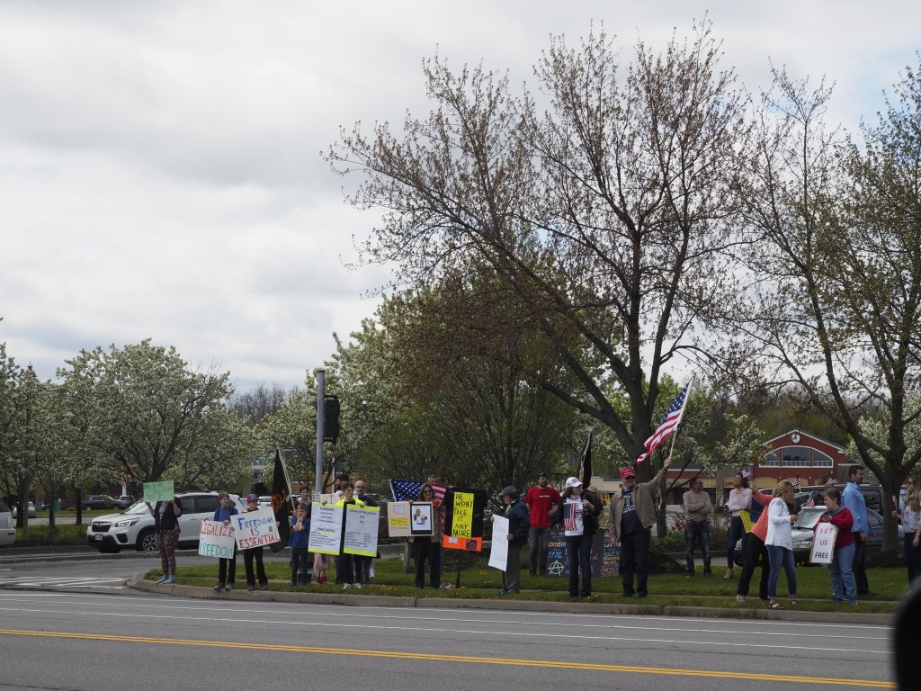 They were gathering to protest the continued closure of much of New York State due to the Covid-19 pandemic. This was one of several gatherings sponsored by — not sure if “sponsored by” is right, maybe “affiliated with” is a better description — a group called #RestartingRoc, members of which, according to at least some of the participants, include fans of the conservative Shannon Joy Show (Radio AM 1180), local Trump supporters, and “WxLive,” hosted on Facebook by former Channel 10 weather forecaster Jeremy Kappell.