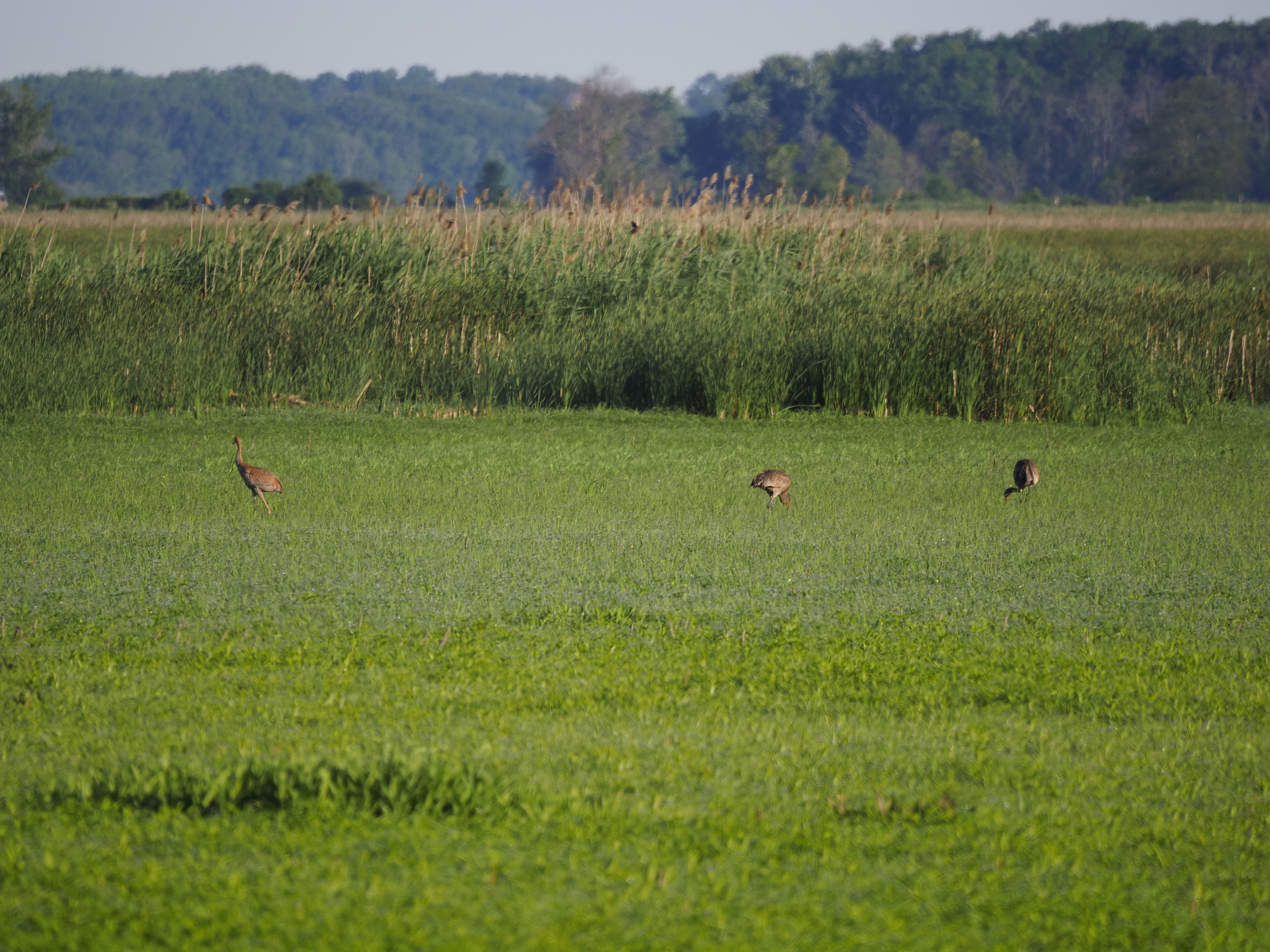 The fish-eating wildlife have mostly vanished to parts unknown, but a few great blue herons, an eagle or two, and some gulls still remain. They obviously didn’t get the memo. The muskrats, beaver, otters, and snakes who lived both in and out of the water are mostly gone, too. Only the ubiquitous species remain — Canada geese, red-wing blackbirds, mallards, some painted turtles, and house sparrows are easily seen along with a few song sparrows, a rare killdeer, and an even rarer yellowlegs. The celebrated sandhill cranes remain, too, but they roam so far out on what used to be the main pool they are visible only as little-dots-with-necks, even with an 800 mm equivalent lens.