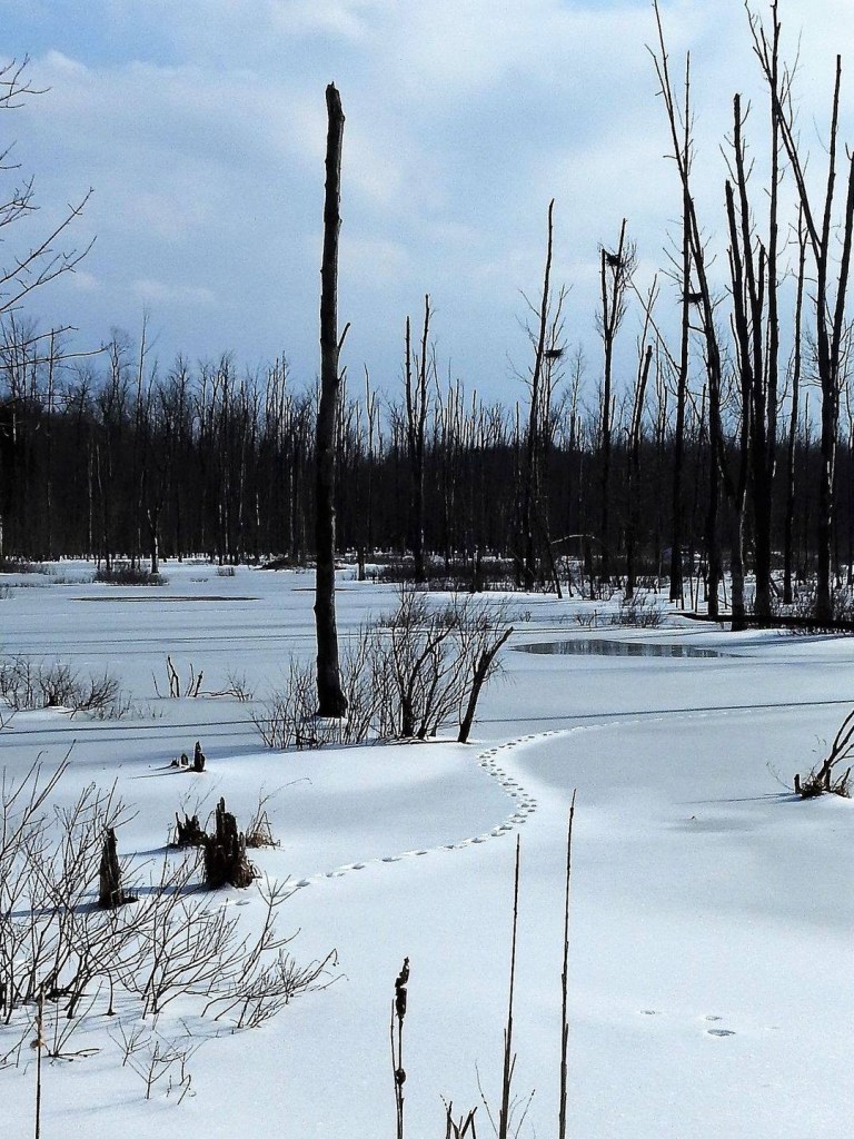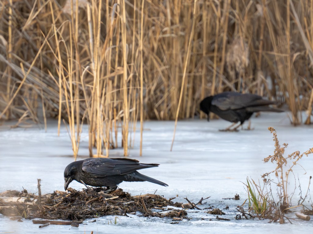 The crows were not welcome in the mucklands, so they annoyed each other and foraged upon the adjacent icy marsh.